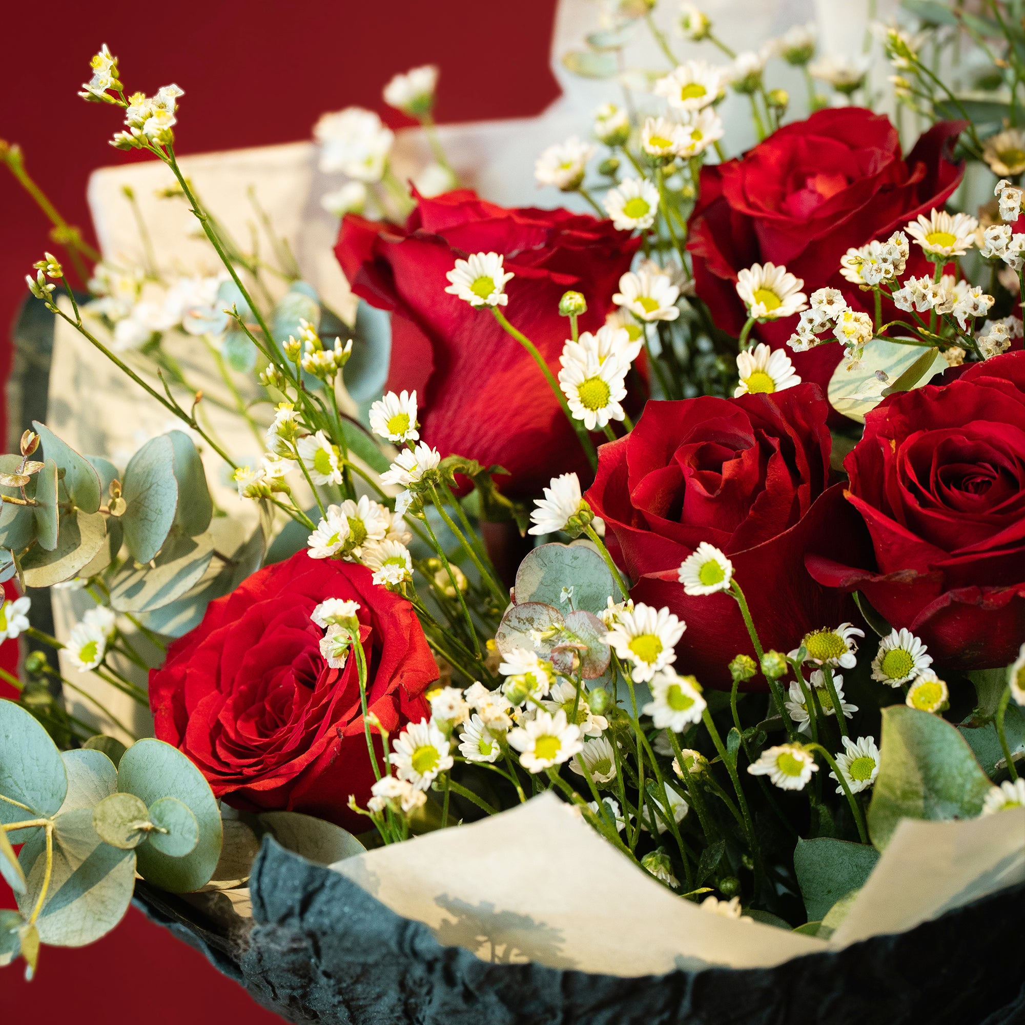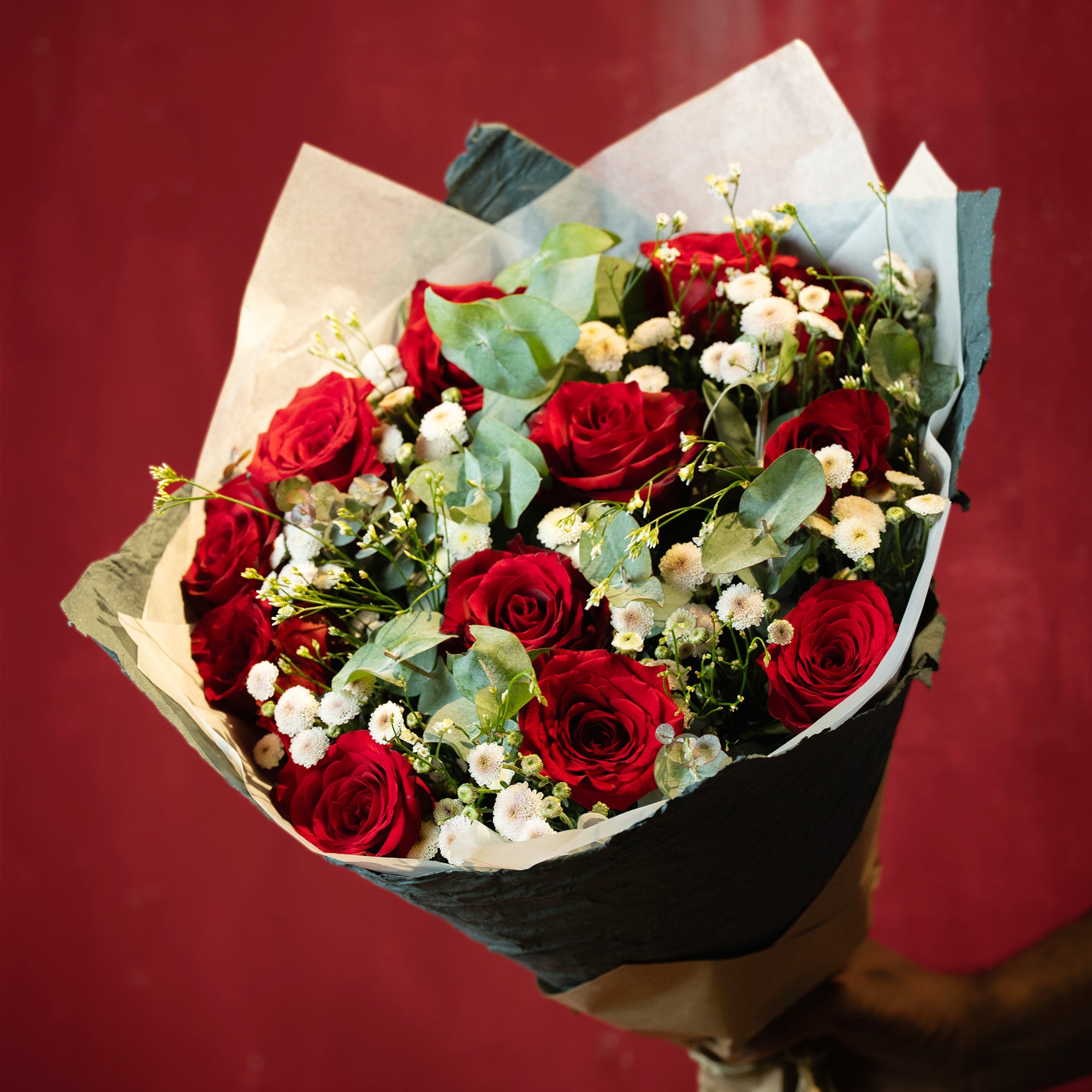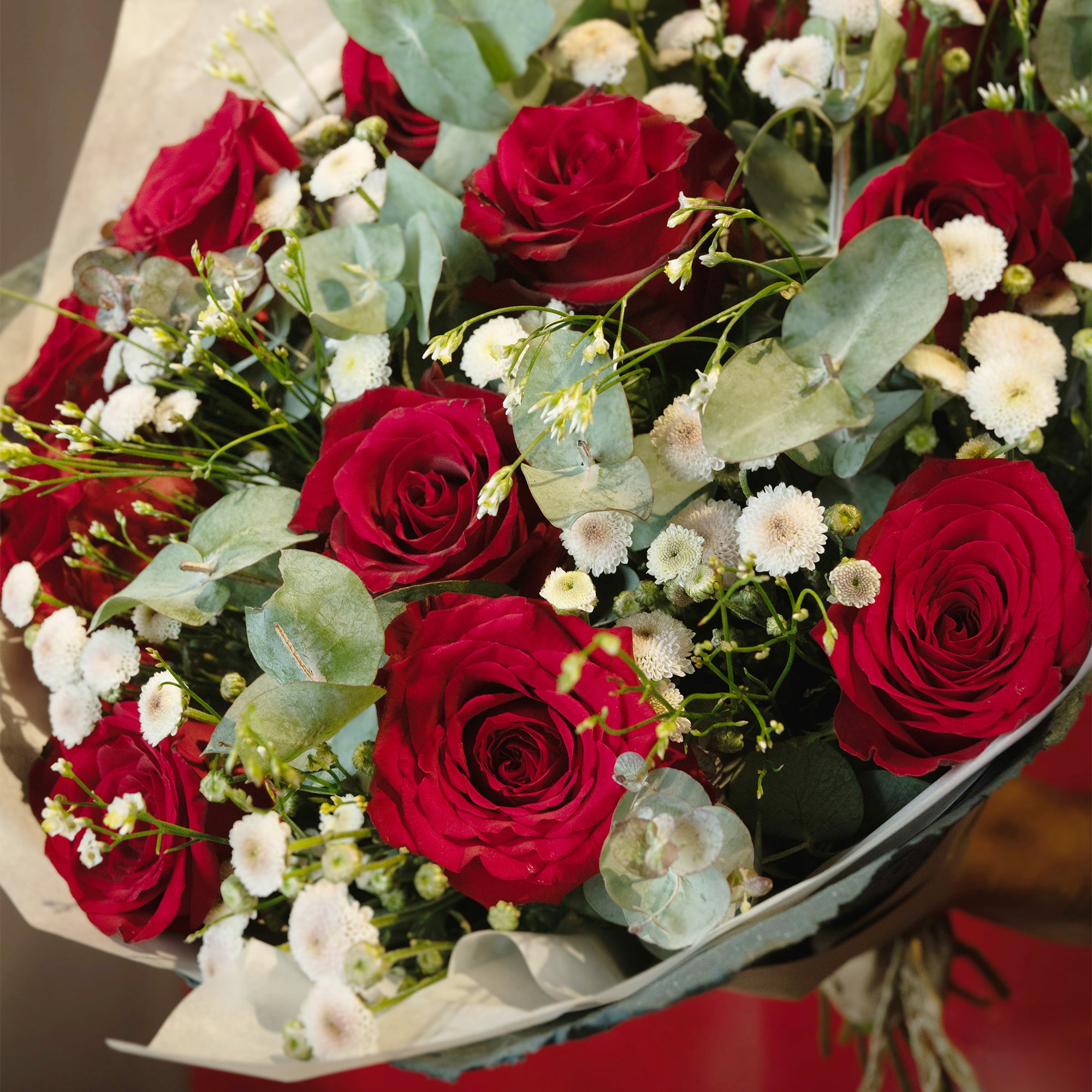 The timeless symbol of love. Full red roses, elegantly wrapped with delicate accents and fresh foliage. Traditional, powerful, and always the right choice.