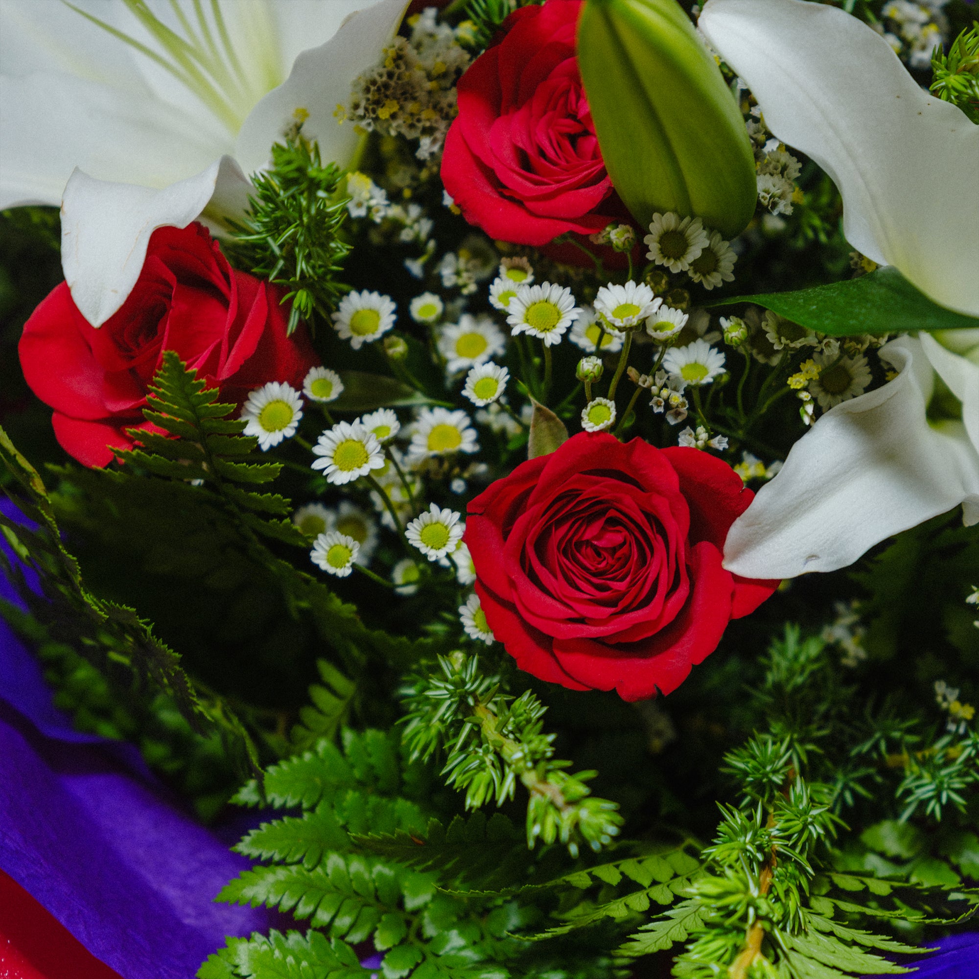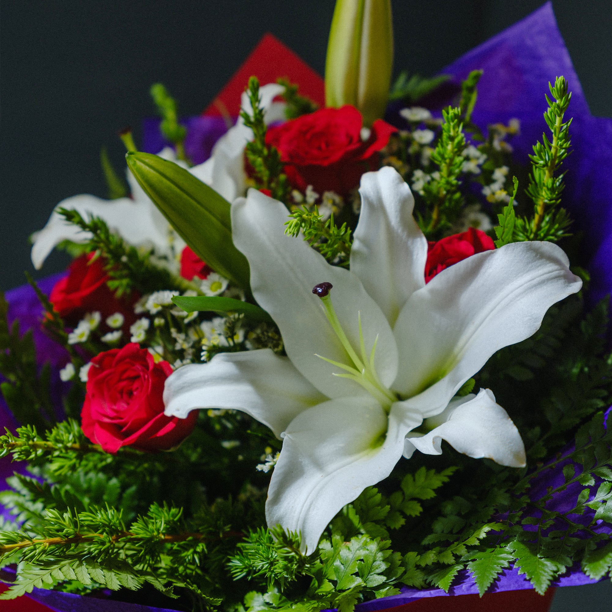 The Bunch Includes; LiliesRosesPompom ChrysanthemumsStatis Special Notes: * Lilies will arrive in bud form for convenient transport and...