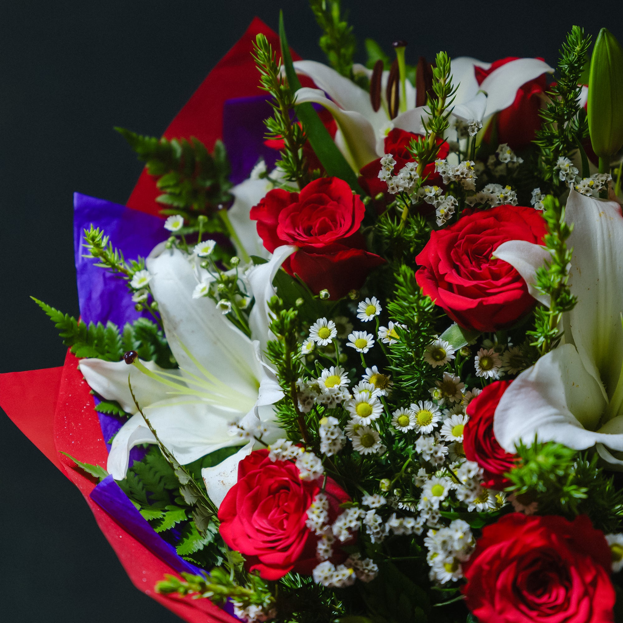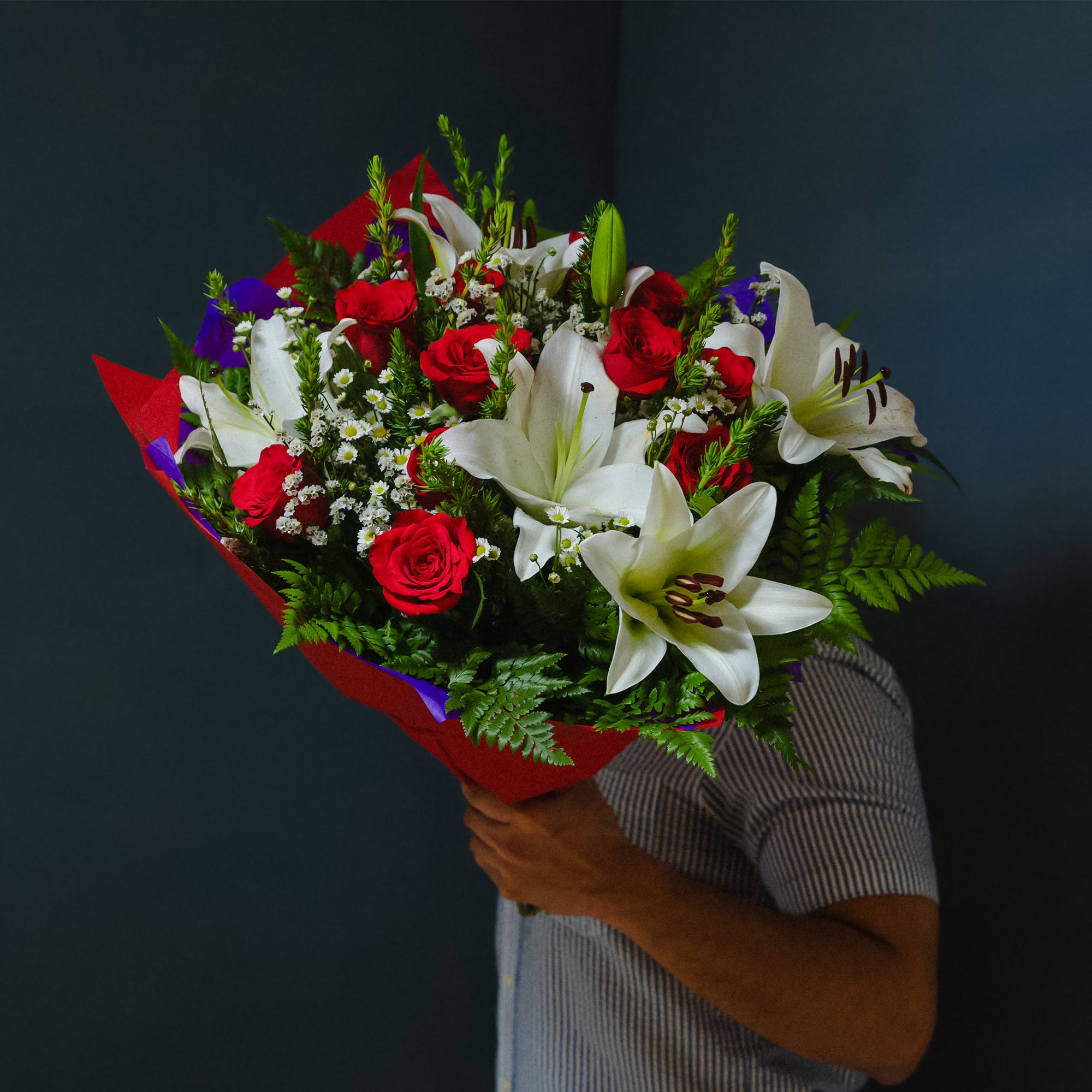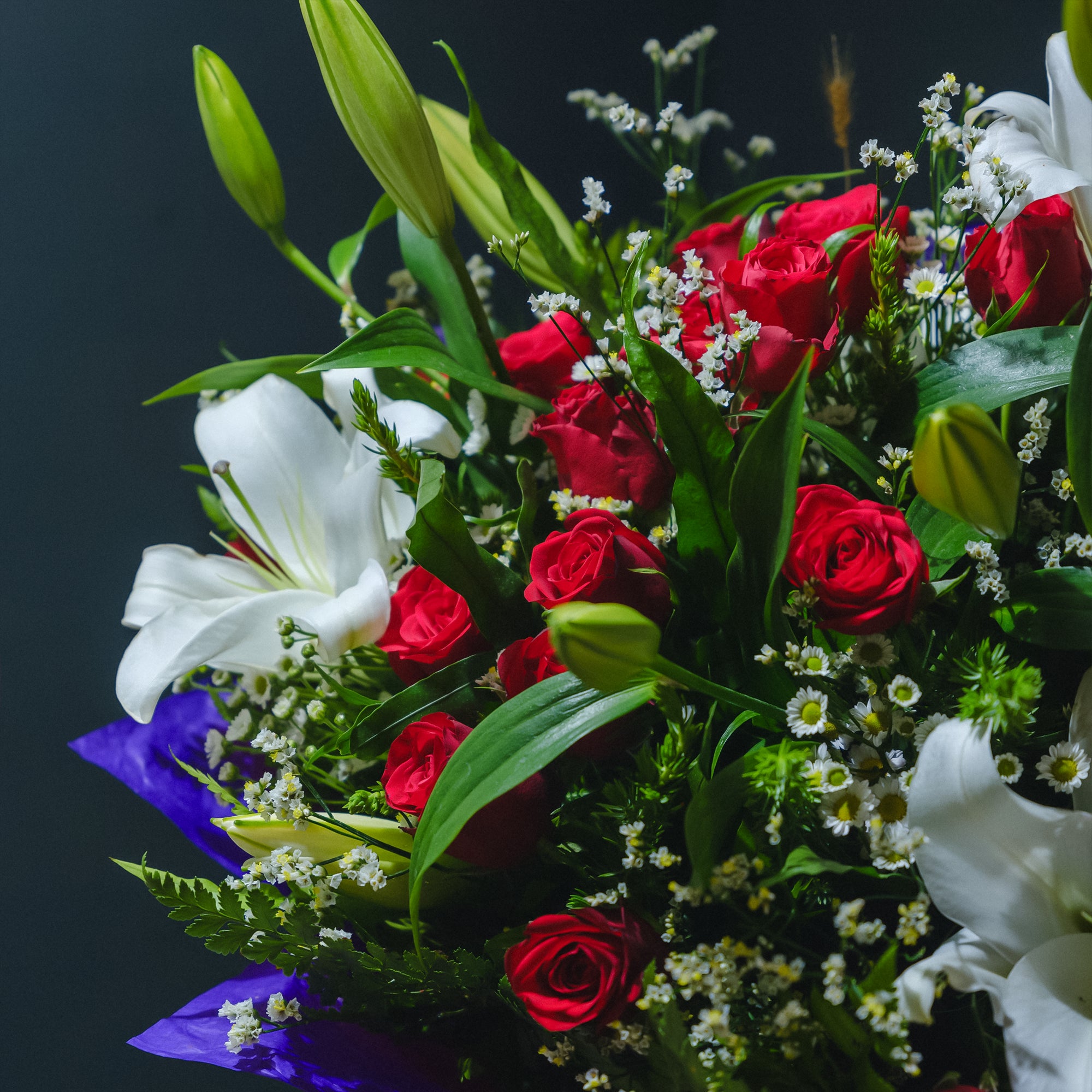 The Bunch Includes;  LiliesRosesPompom ChrysanthemumsStatis Special Notes: * Lilies will arrive in bud form for convenient transport...