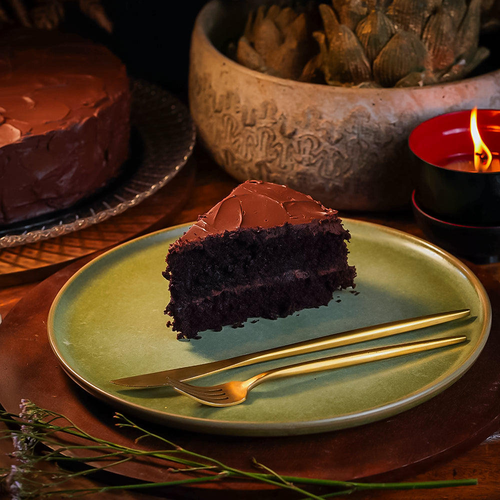 An indulgent creation of moist chocolate sponge layered with silky chocolate ganache and topped with a glossy...
