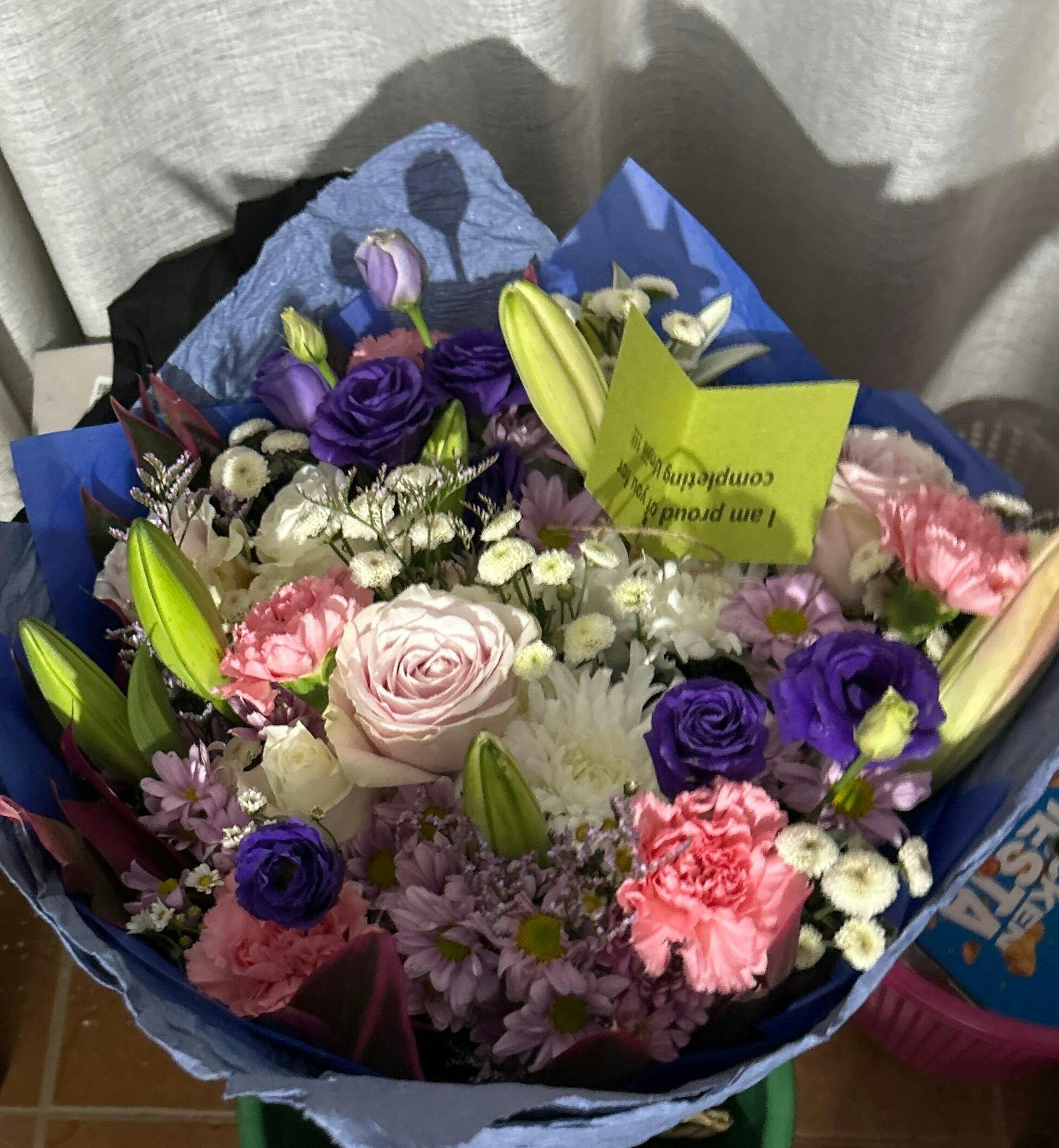A modern, dramatic bouquet with elegant contrast — where pale blooms pop against deep wrapping, like a...