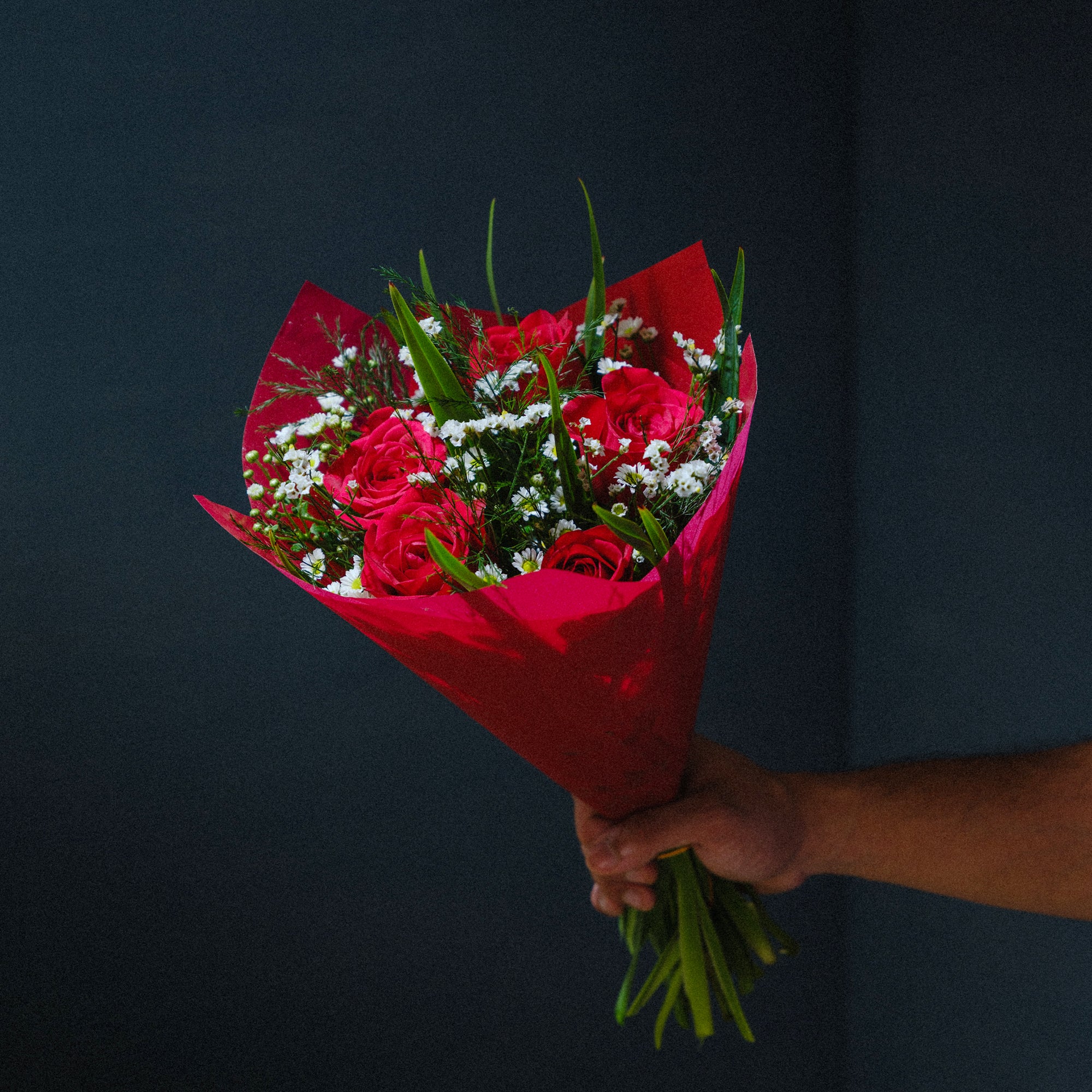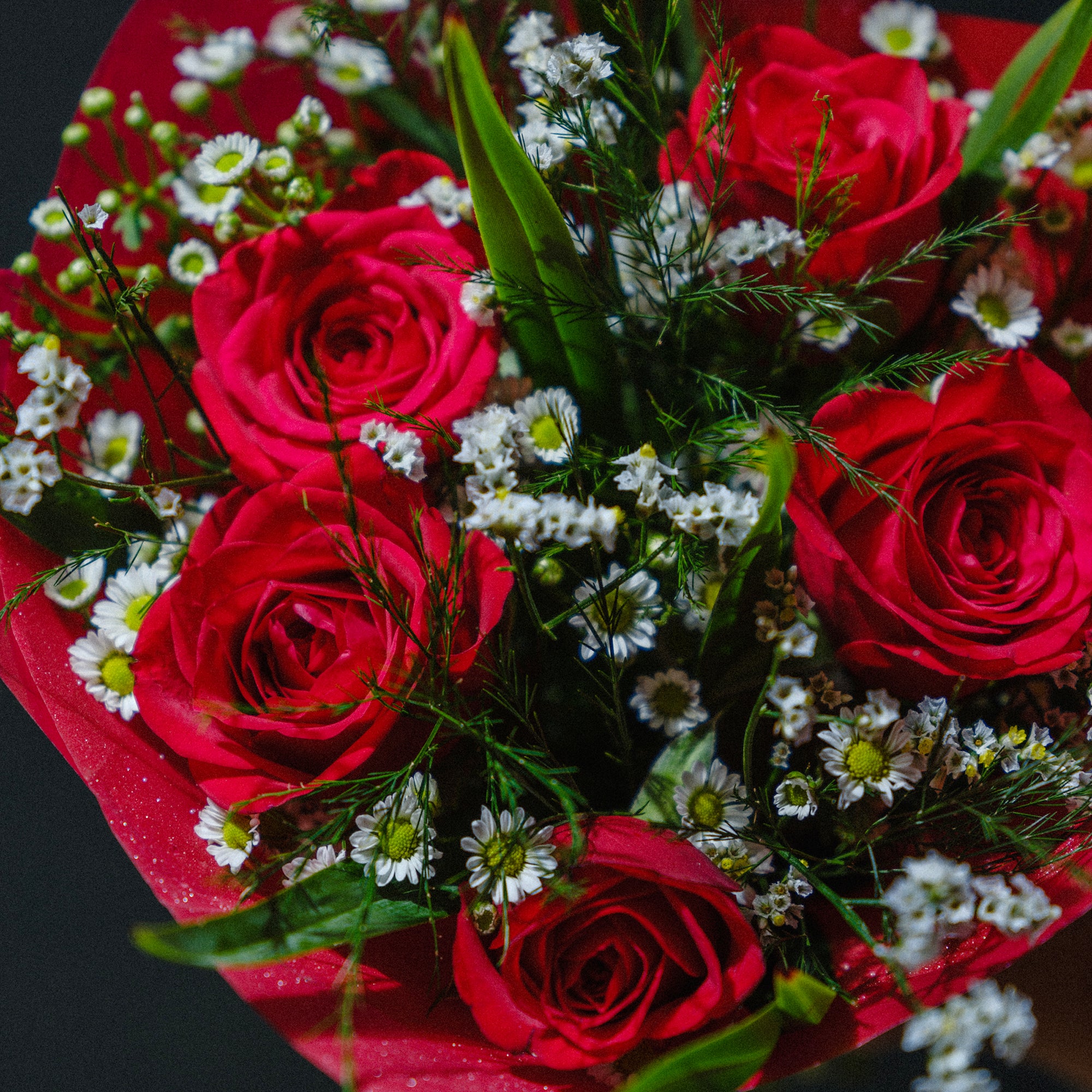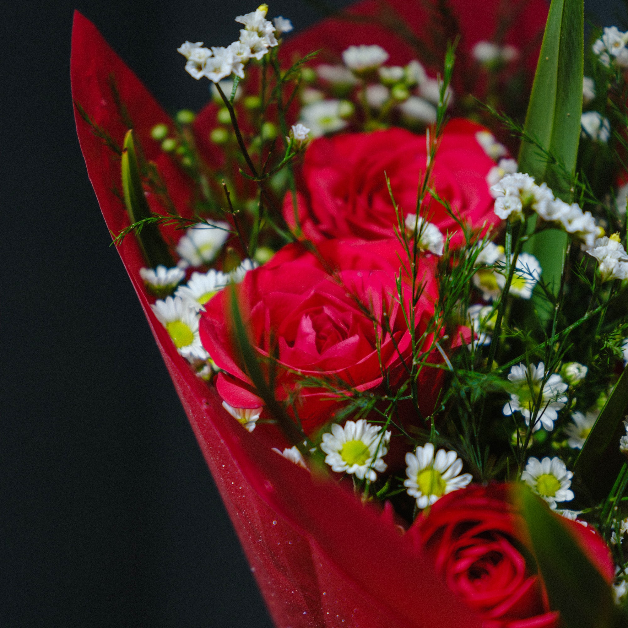 An enchanting bouquet with storybook charm. Vibrant red roses are nestled among delicate mini chrysanthemums and lush foliage, all wrapped in passionate red tones for a classic yet spirited gift.