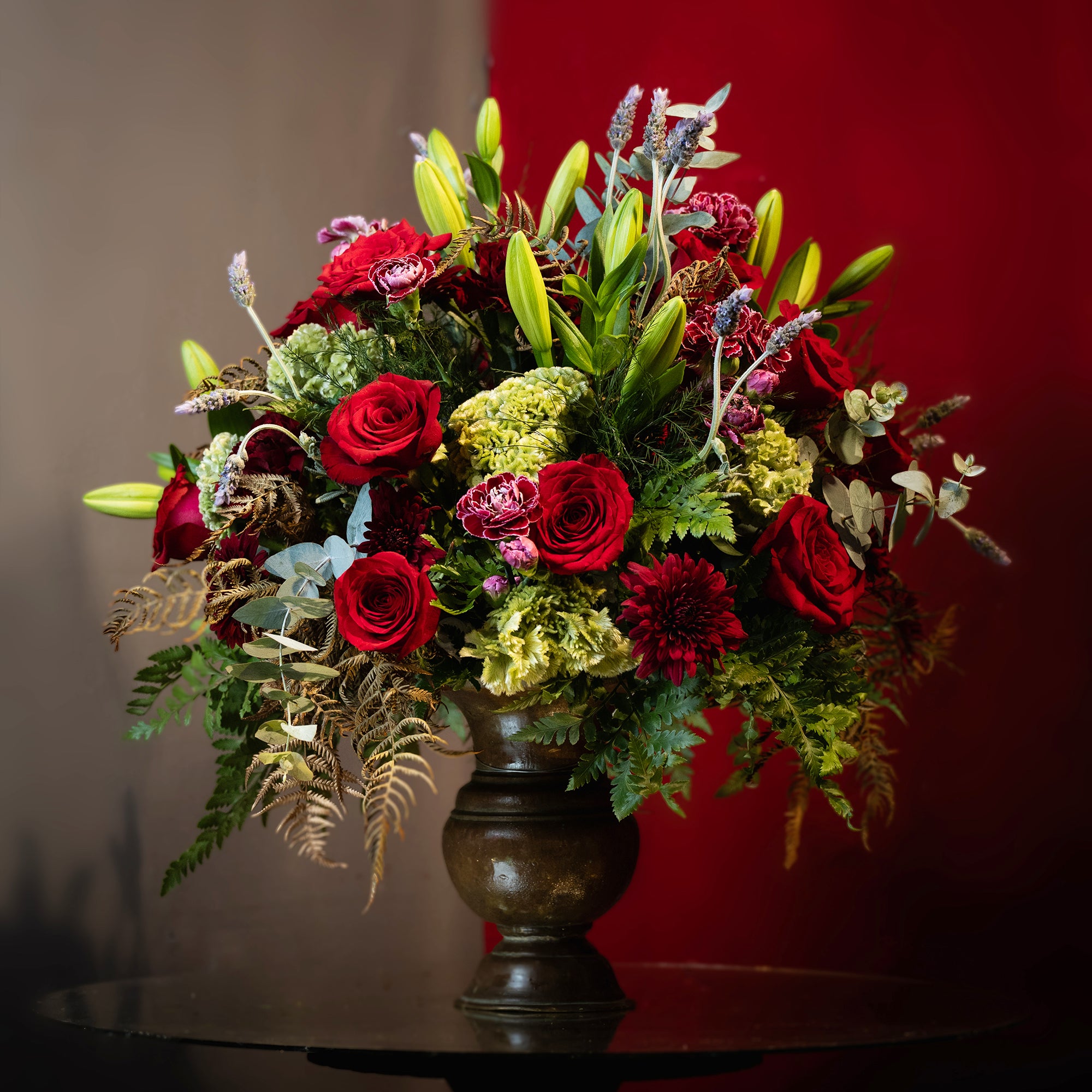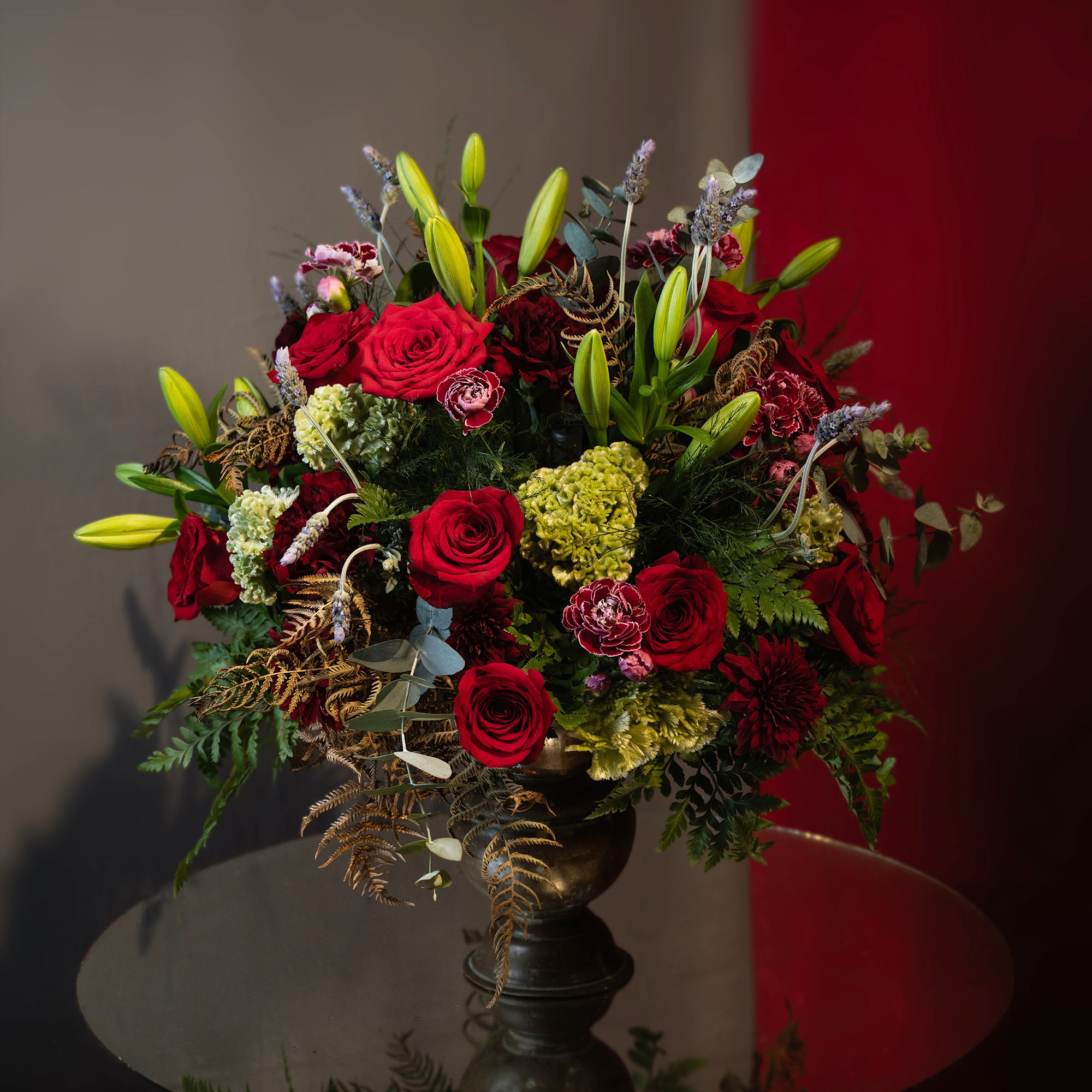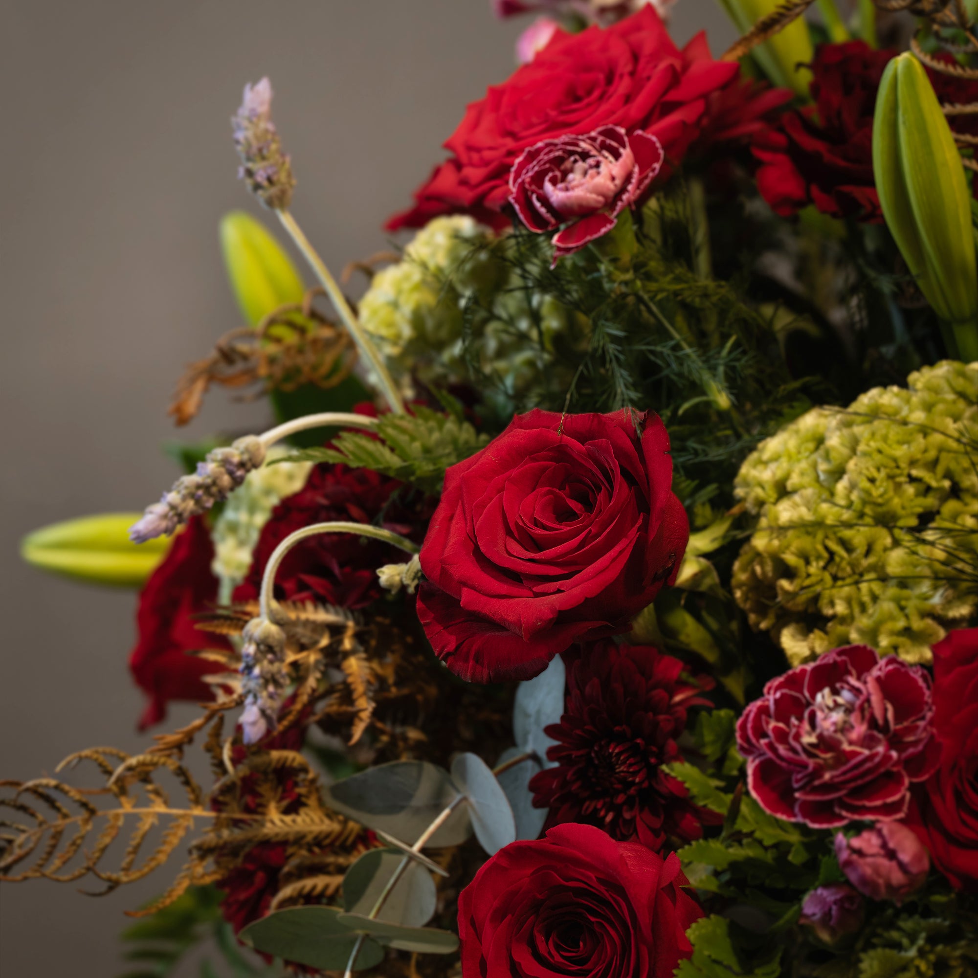 A bold declaration of love in its richest shades. Layers of velvety red roses, passionate carnations, elegant lilies, and dramatic celosia are gathered with lush foliage for a full, luxurious Valentine’s statement. This is not subtle — this is forever energy.