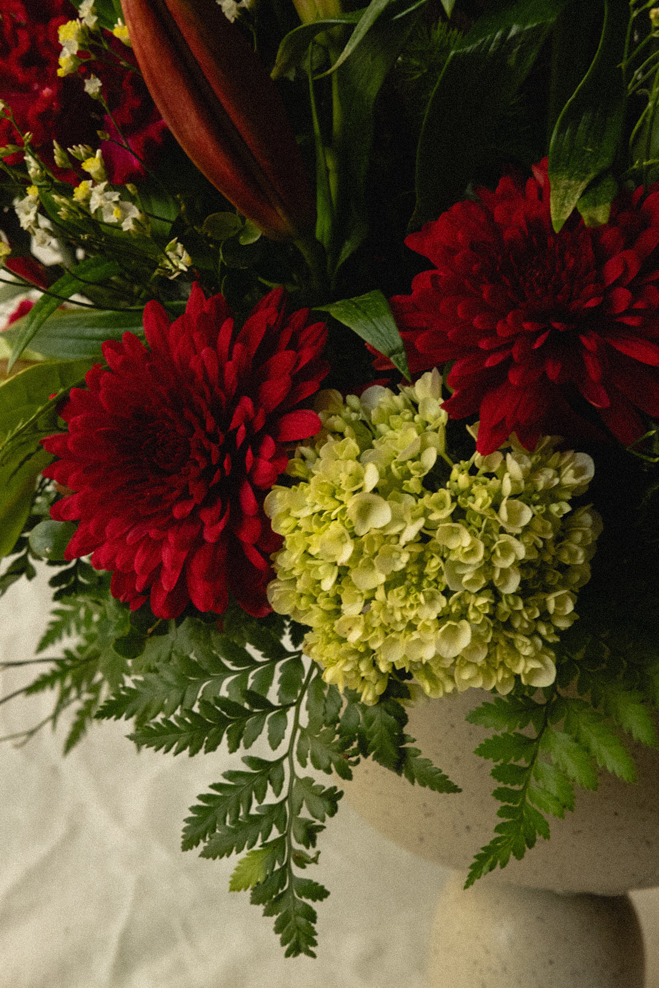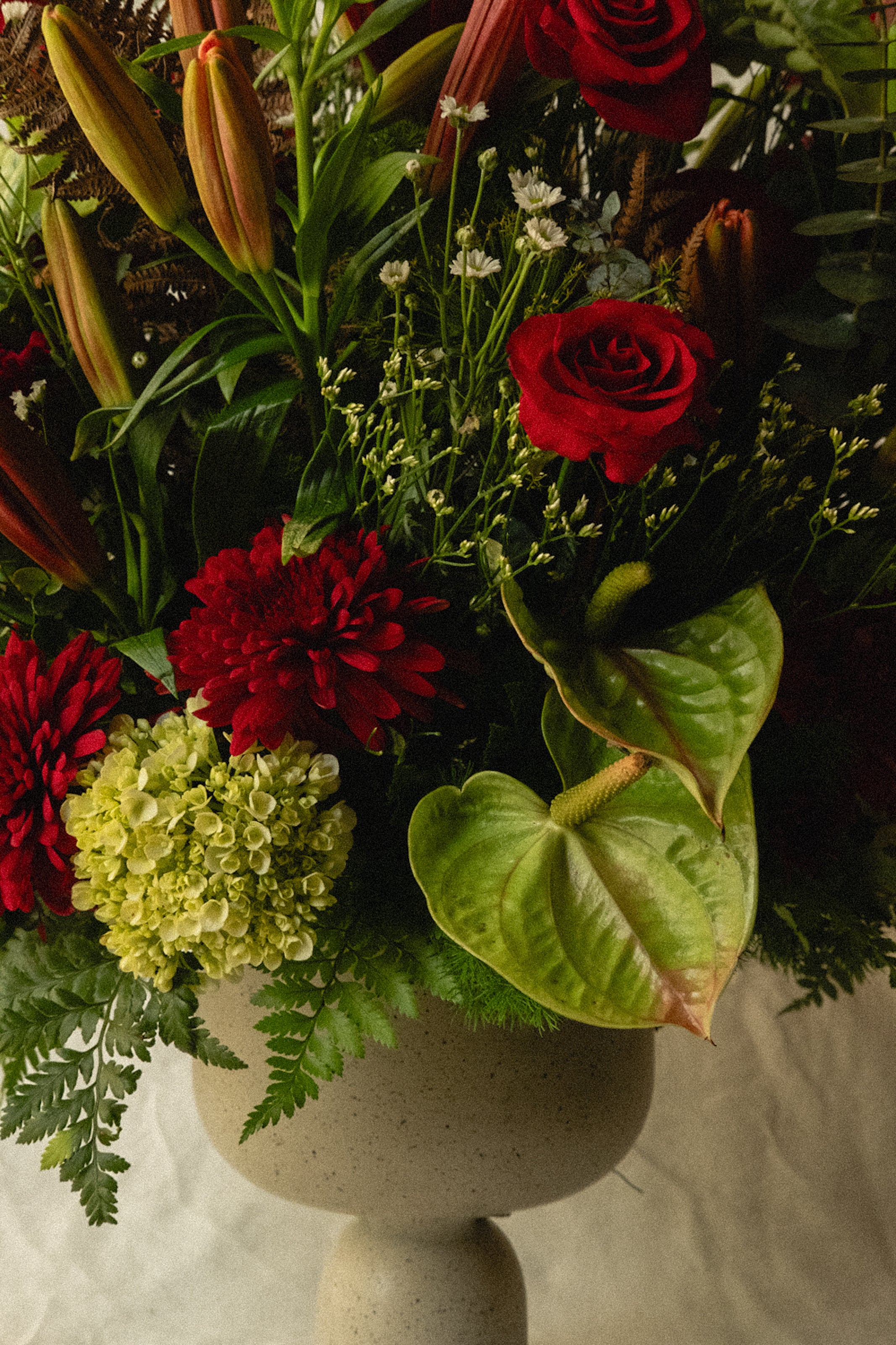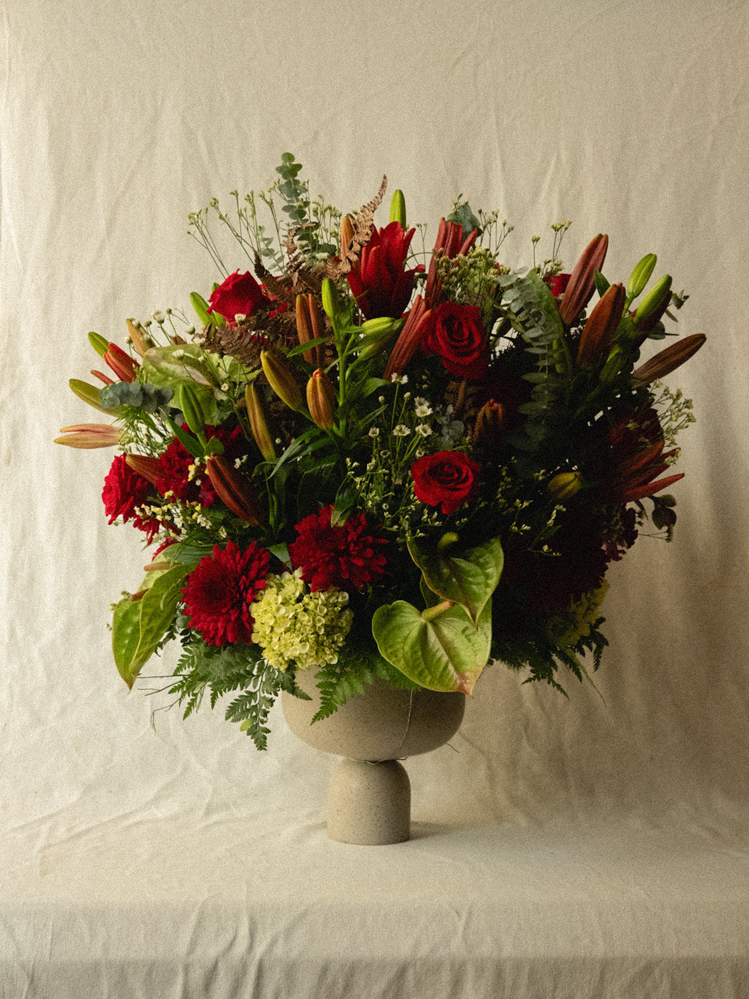 Item Includes; Figar SmallBovitiaRed RosesRed Standard ChryshanthemumRed LilyRed CelociaEucalyptusStatisPapyrusMini whiteKangaroo FernLeather fernGreen AnthuriumHydrangeaDry werella