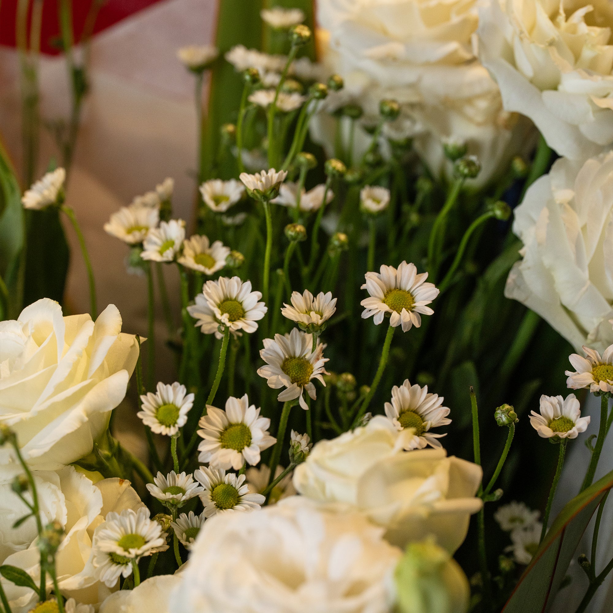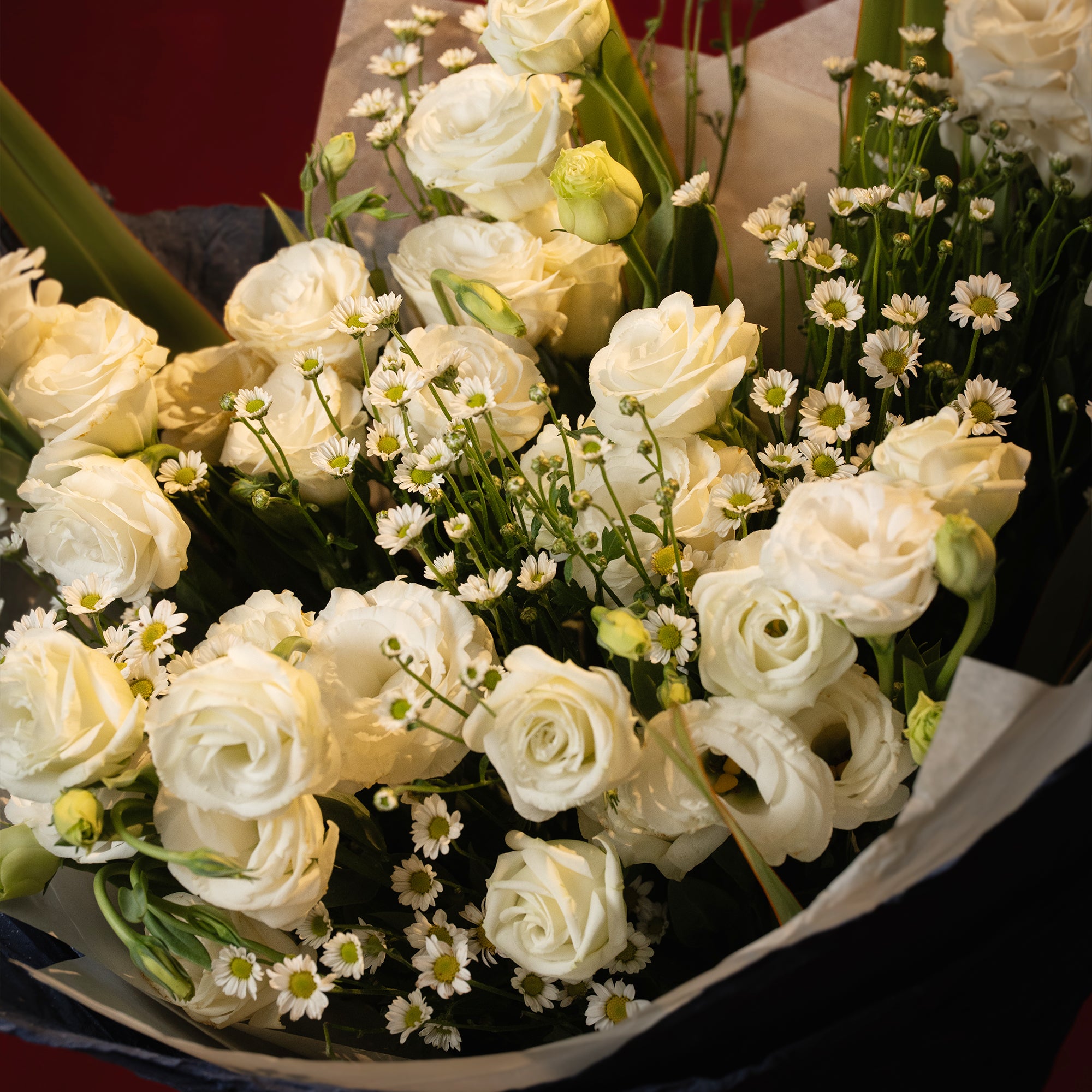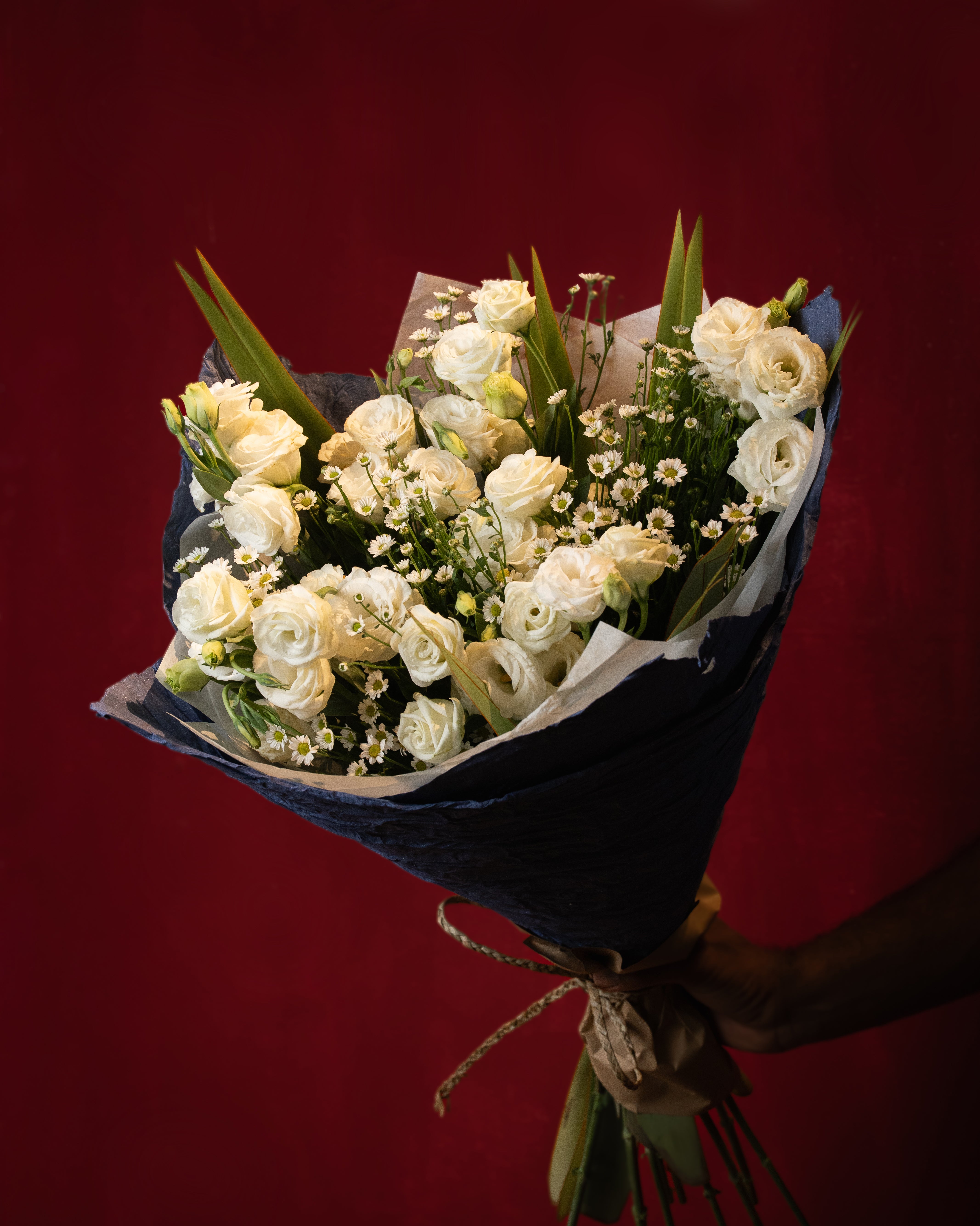 Soft white lisianthus wrapped in cool-toned hues for a fresh, contemporary Valentine’s bouquet. Romantic without being traditional — perfect for someone who loves something different.